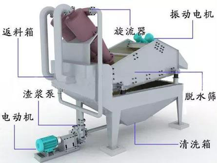 答:细砂回收机主要由洗料槽、砂浆泵、电机、旋流器、振动筛、回料箱等组成。用于砂石厂时主要作用是水洗砂、泥沙分离,因此也叫细砂脱水机、泥沙分离机、泥沙提取机;用于选矿厂时主要作用是尾矿回收,因此也叫尾矿回收机。