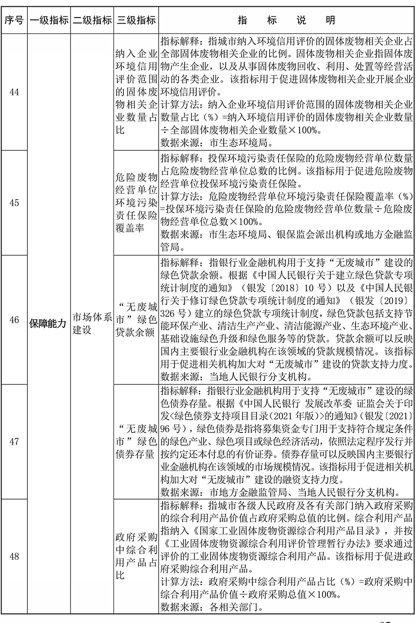 建立健全固体废物环境管理市场体系。优化市场营商环境,鼓励各类市场主体参与“无废城市”建设工作。落实有利于固体废物资源化利用和无害化处置的税收、价格、收费政策。探索建立生活垃圾分类计价、计量收费制度。按照合理盈利原则,探索建立以乡镇、村、企业或经纪人为主体的秸秆收集储存体系。鼓励金融机构加大对“无废城市”建设的金融支持力度。加强“无废城市”建设的市场化投融资机制和商业模式探索,深化政银合作,更好发挥社会资本的市场配置作用。提升县级以上人民政府对资源综合利用产品的政府采购支持力度。