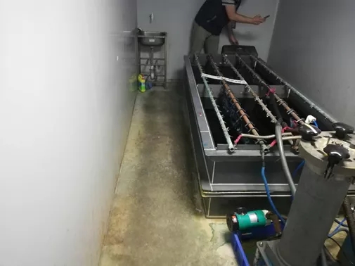 检查发现,该作坊主要从事五金电镀业务,现场未能提供工商营业执照,也没有相关环保审批、验收手续。该电镀作坊是一间置于民房天台的单层活动板房,有黑色网布遮掩,板房的加工区域设有三重门禁,电镀工序设置在最内层的密室中。执法人员进入密室后,发现两条正在工作的电镀槽。
