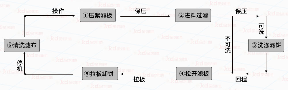 进入保压状态后,检查各管路阀门开闭状况,确认无误后启动进料泵,慢慢开启进料阀,料浆即通过止推板上的进料孔进入各滤室,在规定压力下实现加压过滤,形成滤饼。